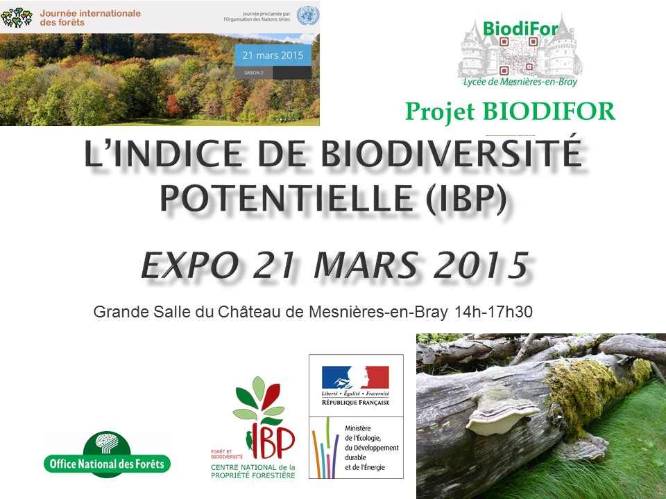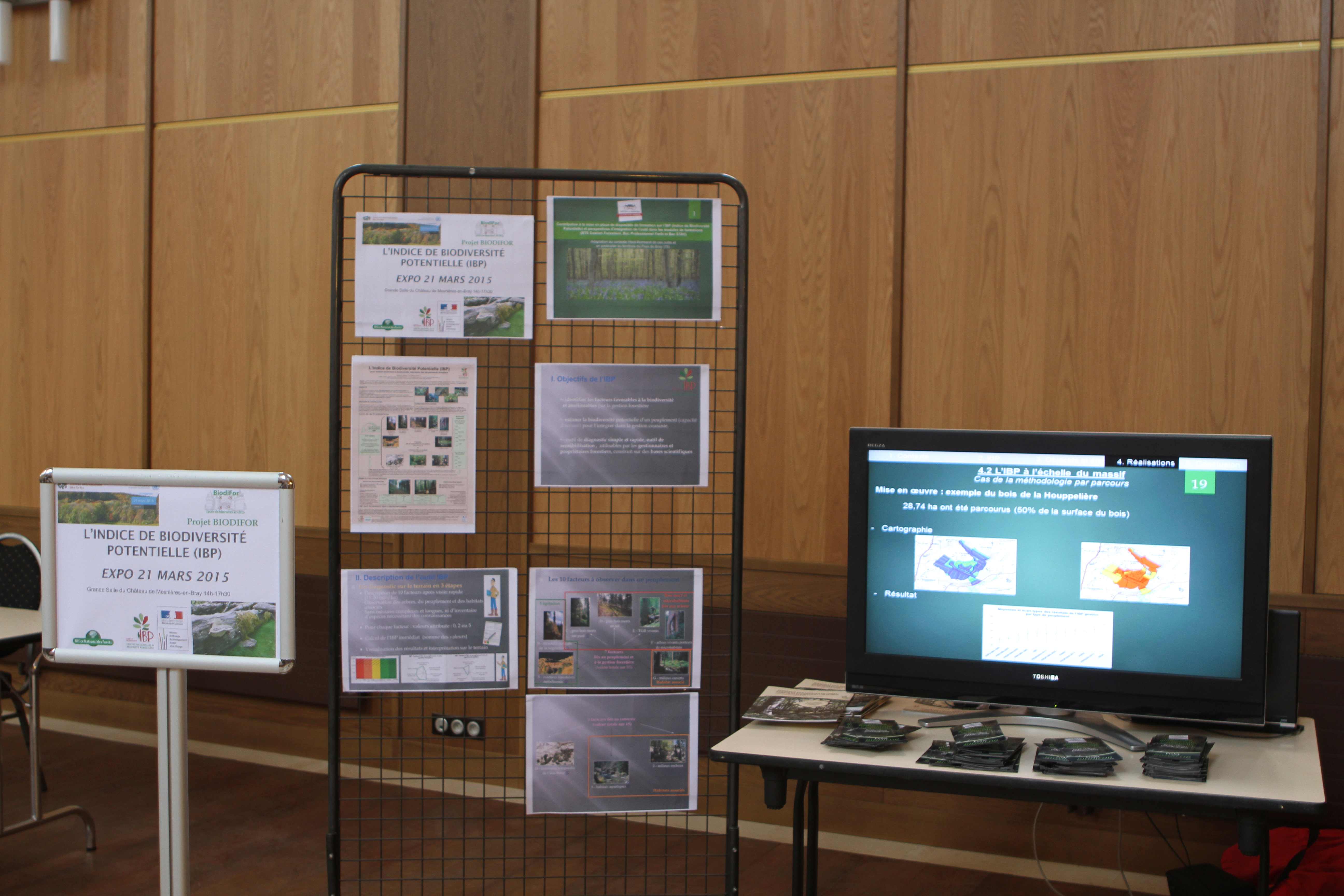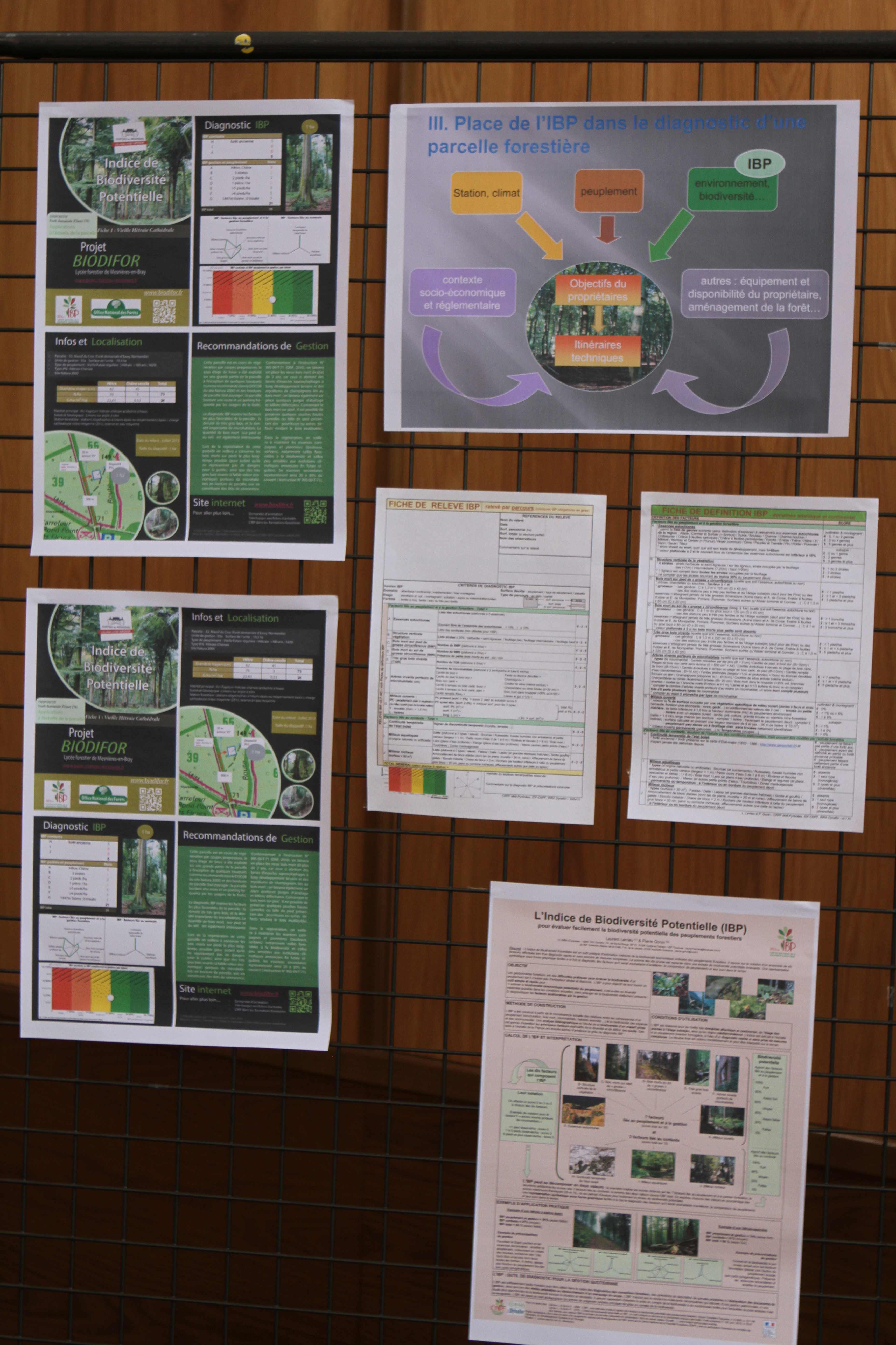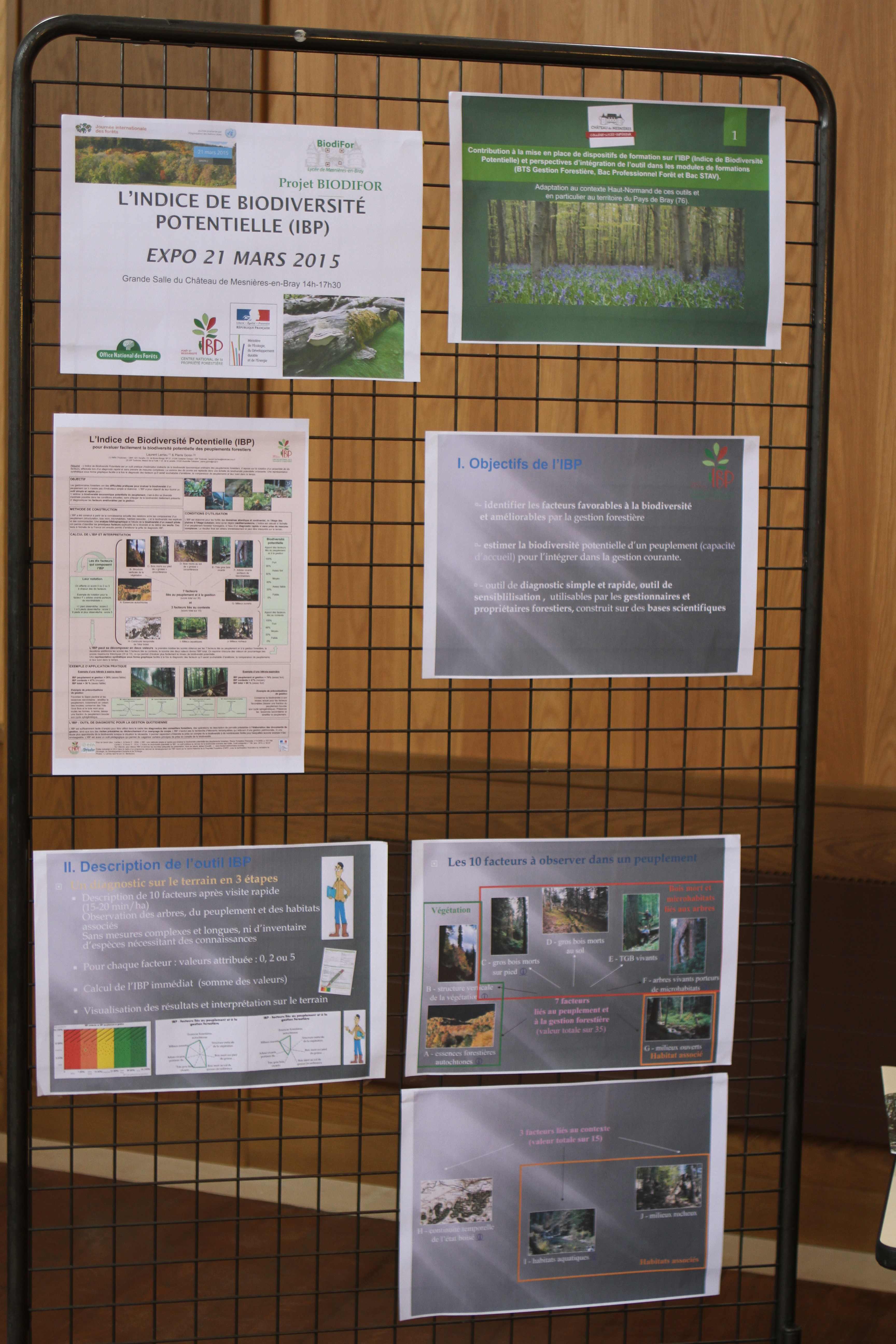 Durant l'année 2015, nous avons monté un kit d'exposition pour expliquer au grand public notre projet Biodifor mais aussi ce qu'est l'IBP (indice de biodiversité potentielle). Cette exposition est composées d'affiches expliquant les facteurs composant l'IBP, de cartes thématiques (par facteur de l'IBP) issues d'un travail à l'échelle d'une propriété, d'un diaporama illustrant les différentes facettes du projet réalisé au lycée forestier de Mesnières-en-Bray et de flyers/ plaquettes de présentation.