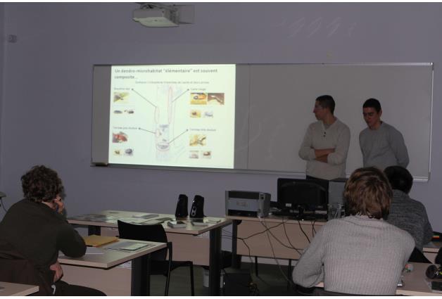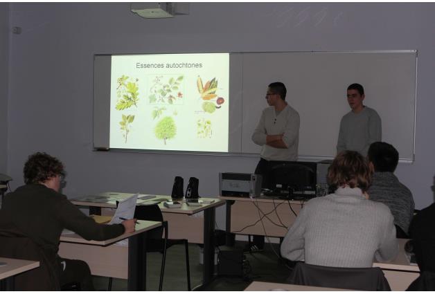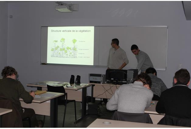 Une première séance de deux heures a consisté à expliquer le principe du projet BIODIFOR, à savoir la sensibilisation de la biodiversité et la familiarisation aux outils d'évaluation de la biodiversité potentielle des peuplements auprès des lycées à formation forestière et agricole. Ensuite est venue la présentation de l'IBP (Indice de Biodiversité Potentielle) et ses 10 facteurs. L'IBP permet d’évaluer la capacité d'accueil en espèces d'un peuplement forestier, de diagnostiquer les éléments favorables ou améliorables par la gestion .