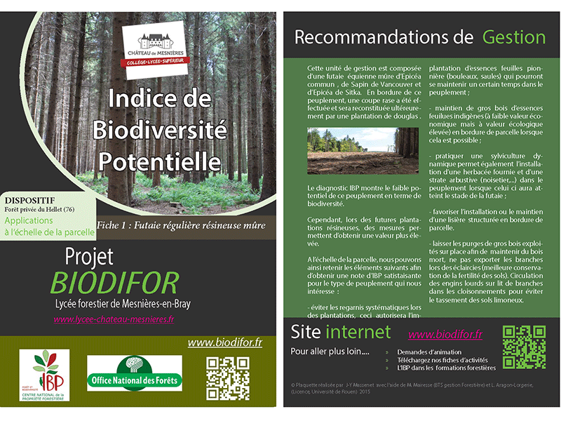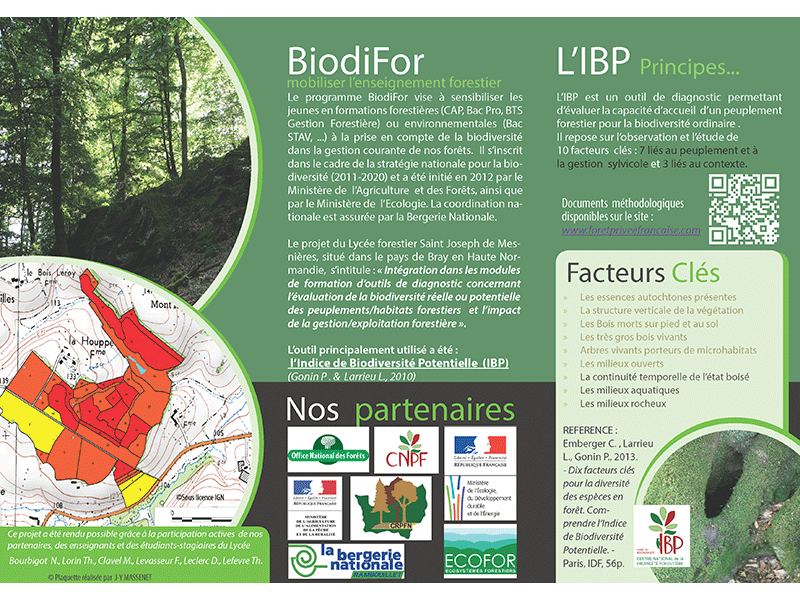 BiodiFor se décline en plusieurs projets réalisés au sein de 6 Lycée forestiers. Celui du Lycée forestier de Mesnières (Normandie) a pour support l'indice de biodiversité potentielle (IBP) et a pour cadre les forêts domaniales ou privées de la région.