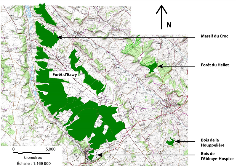 Les sites retenus (figure ci-dessous) sont composés de forêts privées et publiques. Les trois propriétés privées retenus : le bois du Hellet, le bois de la Houppelière et les Bois de l’Abbaye et de l’Hospice, ont été sélectionnées pour leur proximités et l’existence d’accords entre les propriétaires et le lycée. La forêt d’Eawy, principale forêt domaniale du Pays de Bray a été retenue pour sa proximité et la faisabilité de l’étude sur l’évolution du cortège floristique et de l’IBP le long du cycle sylvicole en hêtraie à jacinthe (Endymio-Fagetum).